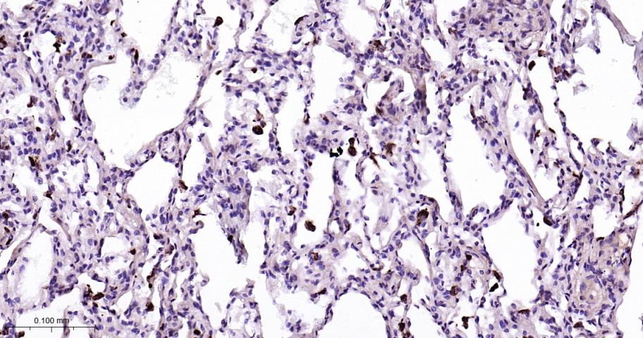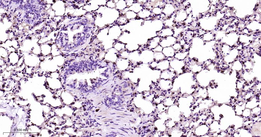 Paraformaldehyde-fixed, paraffin embedded Mouse Lung; Antigen retrieval by boiling in sodium citrate buffer (pH6.0) for 15 min; Antibody incubation with Lysozyme Monoclonal Antibody, Unconjugated(bsm-60643R) at 1:200 overnight at 4°C, followed by conjugation to the bs-0295G-HRP and DAB (C-0010) staining.