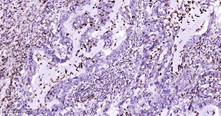 Paraformaldehyde-fixed, paraffin embedded Human Lung Cancer; Antigen retrieval by boiling in sodium citrate buffer (pH6.0) for 15 min; Antibody incubation with Lysozyme Monoclonal Antibody, Unconjugated(bsm-60643R) at 1:200 overnight at 4°C, followed by conjugation to the bs-0295G-HRP and DAB (C-0010) staining.