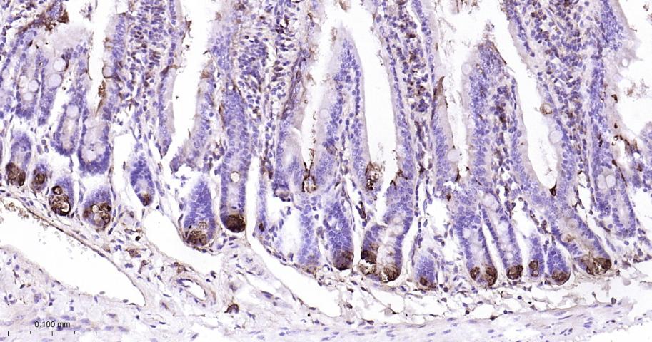 Paraformaldehyde-fixed, paraffin embedded Mouse Small Intestine; Antigen retrieval by boiling in sodium citrate buffer (pH6.0) for 15 min; Antibody incubation with Lysozyme Monoclonal Antibody, Unconjugated(bsm-60643R) at 1:200 overnight at 4°C, followed by conjugation to the bs-0295G-HRP and DAB (C-0010) staining.