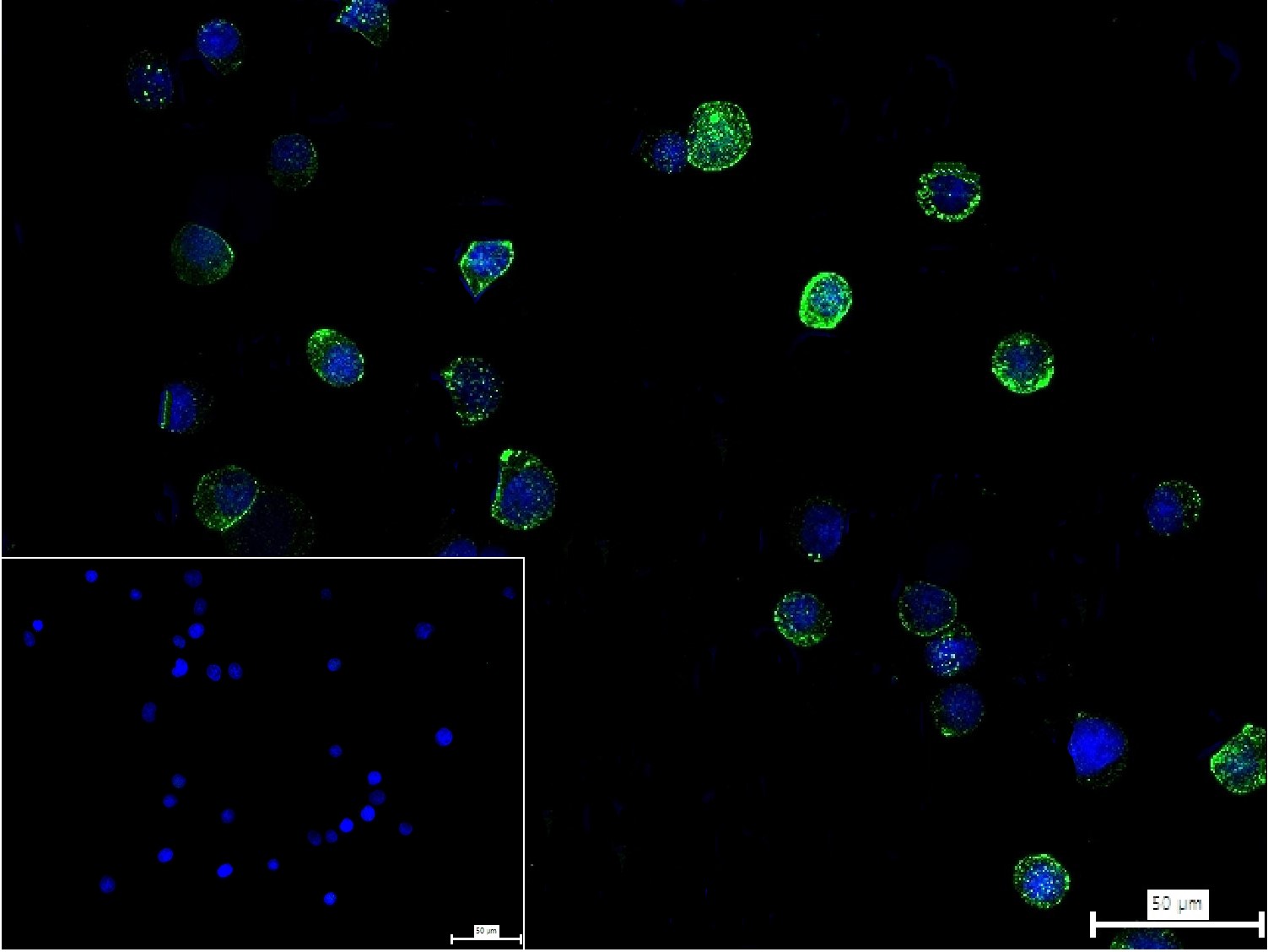 4% Paraformaldehyde-fixed Jurkat (H) cell; Antibody incubation with (Moesin) monoclonal Antibody, unconjugated (bsm-60653R) 1:100, 90 min at 37°C; followed by conjugated Goat Anti-Rabbit IgG antibody (green, bs-60295G-BF488) at 37°C for 90 min, DAPI (blue, C02-04002) was used to stain the cell nuclei. PBS instead of the primary antibody was used as the blank control.