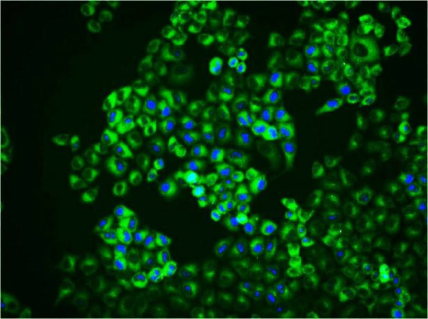 Hela cell; 4% Paraformaldehyde-fixed; Triton X-100 at room temperature for 20 min; Blocking buffer (normal goat serum, C-0005) at 37°C for 20 min; Antibody incubation with (SQSTM1/p62) monoclonal Antibody, Unconjugated (bsm-60709R) 1:100, 90 minutes at 37°C; followed by a conjugated Goat Anti-Rabbit IgG antibody at 37°C for 90 minutes, DAPI (blue, C02-04002) was used to stain the cell nuclei.