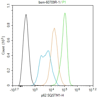 The HepG2 (H) cells were fixed with 4% PFA (10 min at r.t.) and then permeabilized with 90% ice-cold methanol for 20 min at -20℃,the cells then were incubated in 5%BSA to block non-specific protein-protein interactions (30 min at r.t.).Primary Antibody (green):Rabbit Anti-p62 SQSTM1 antibody (bsm-60709R): 1 μg/10^6 cells; Secondary Antibody (white blue): Goat anti-Rabbit IgG-BF488 (bs-60295G-BF488): 1 μg/test. Isotype Control (orange): Rabbit IgG (bs-0295P). Blank control (black): PBS. Acquisition of 20,000 events was performed.