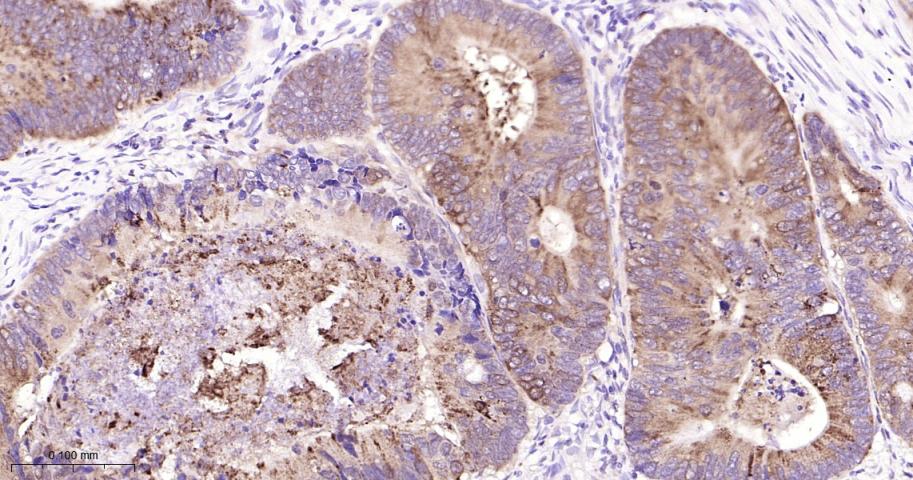 Paraformaldehyde-fixed, paraffin embedded Human colon cancer; Antigen retrieval by boiling in sodium citrate buffer (pH6.0) for 15 min; Antibody incubation with SQSTM1/p62 Monoclonal Antibody, Unconjugated(bsm-60709R) at 1:200 overnight at 4°C, followed by conjugation to the bs-0295G-HRP and DAB (C-0010) staining.