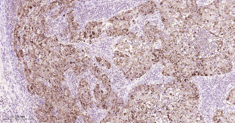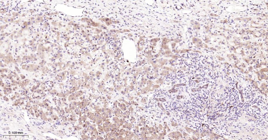 Paraformaldehyde-fixed, paraffin embedded Human liver cancer; Antigen retrieval by boiling in sodium citrate buffer (pH6.0) for 15 min; Antibody incubation with SQSTM1/p62 Monoclonal Antibody, Unconjugated(bsm-60709R) at 1:200 overnight at 4°C, followed by conjugation to the bs-0295G-HRP and DAB (C-0010) staining.