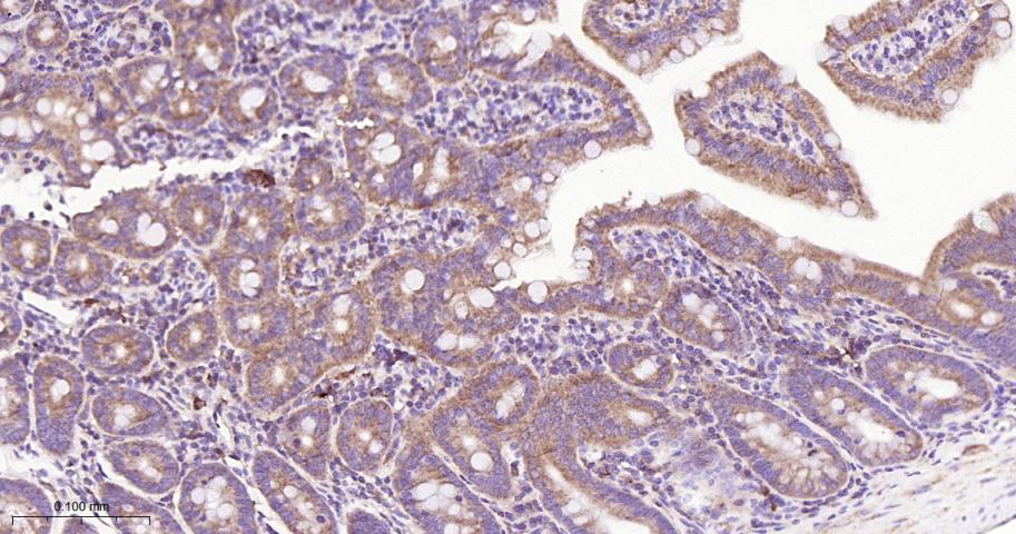 Paraformaldehyde-fixed, paraffin embedded Rat small intestine; Antigen retrieval by boiling in sodium citrate buffer (pH6.0) for 15 min; Antibody incubation with SQSTM1/p62 Monoclonal Antibody, Unconjugated(bsm-60709R) at 1:200 overnight at 4°C, followed by conjugation to the bs-0295G-HRP and DAB (C-0010) staining.