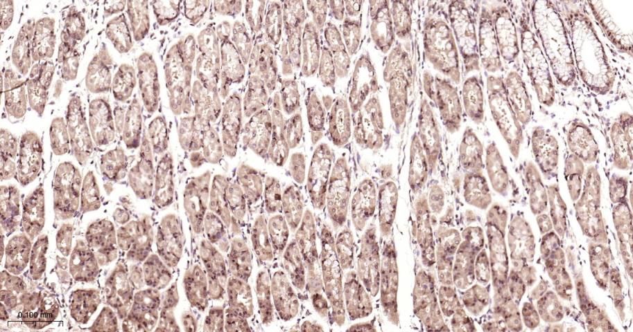 Paraformaldehyde-fixed, paraffin embedded Human stomach fundus; Antigen retrieval by boiling in sodium citrate buffer (pH6.0) for 15 min; Antibody incubation with SQSTM1/p62 Monoclonal Antibody, Unconjugated(bsm-60709R) at 1:200 overnight at 4°C, followed by conjugation to the bs-0295G-HRP and DAB (C-0010) staining.