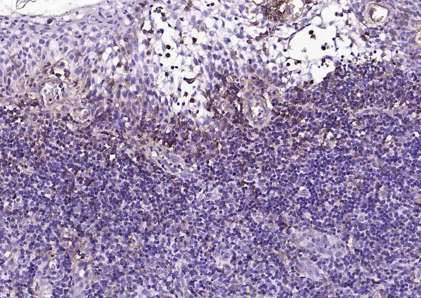 Paraformaldehyde-fixed, paraffin embedded (human tonsil); Antigen retrieval by boiling in sodium citrate buffer (pH6.0) for 15min; Block endogenous peroxidase by 3% hydrogen peroxide for 20 minutes; Blocking buffer (normal goat serum) at 37°C for 30min; Incubation with (CD39/ENTPD1) Monoclonal Antibody, Unconjugated (bsm-54043R) at 1:200 overnight at 4°C, followed by operating according to SP Kit(Rabbit) (sp-0023) instructionsand DAB staining.