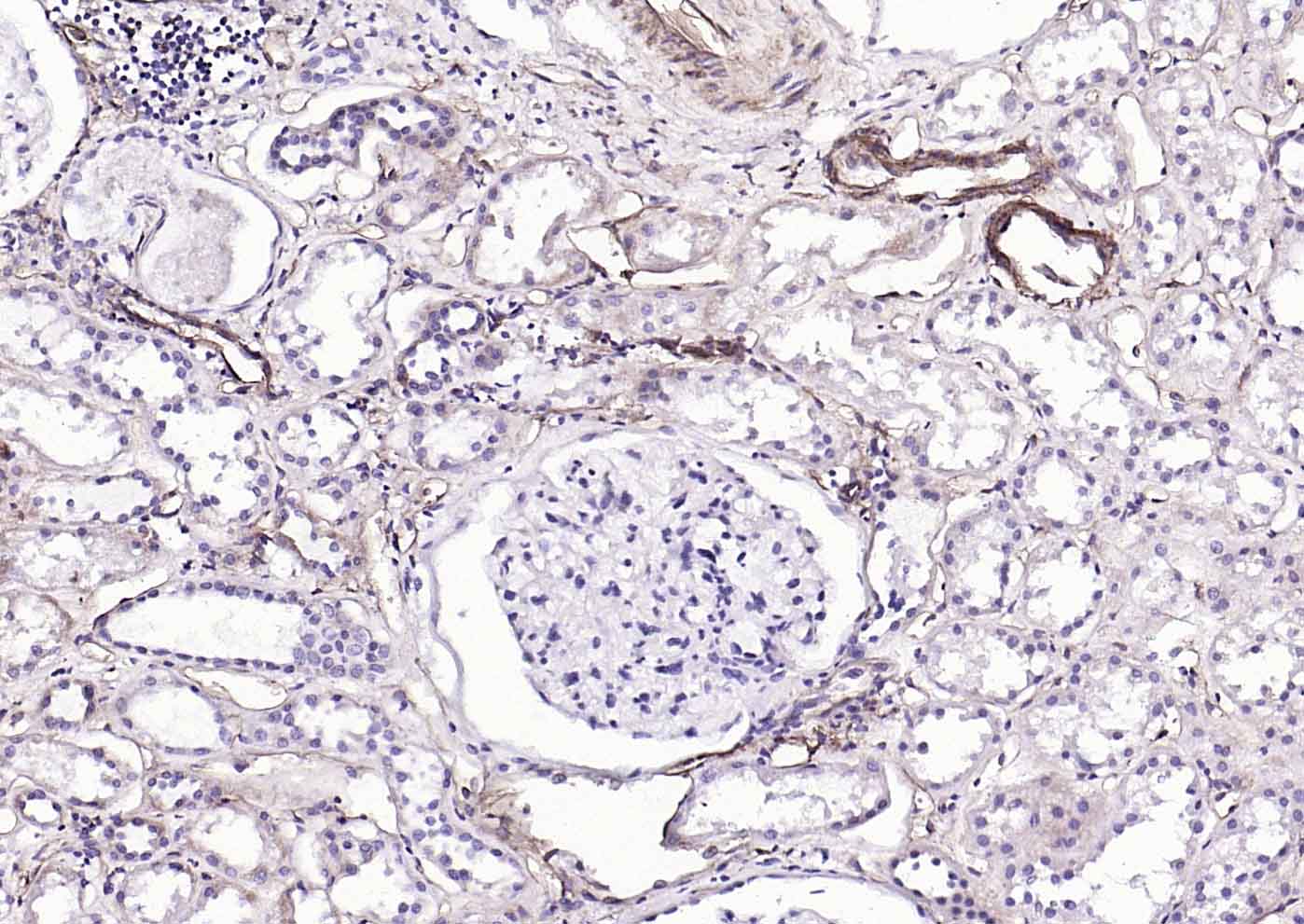 Paraformaldehyde-fixed, paraffin embedded (human kidney); Antigen retrieval by boiling in sodium citrate buffer (pH6.0) for 15min; Block endogenous peroxidase by 3% hydrogen peroxide for 20 minutes; Blocking buffer (normal goat serum) at 37°C for 30min; Incubation with (CD39/ENTPD1) Monoclonal Antibody, Unconjugated (bsm-54043R) at 1:200 overnight at 4°C, followed by operating according to SP Kit(Rabbit) (sp-0023) instructionsand DAB staining.