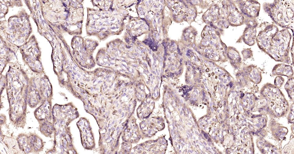 Paraformaldehyde-fixed, paraffin embedded Human Placenta; Antigen retrieval by boiling in sodium citrate buffer (pH6.0) for 15 min; Antibody incubation with AACT Monoclonal Antibody, Unconjugated(bsm-60780R) at 1:200 overnight at 4°C, followed by conjugation to the SP Kit (Rabbit, SP-0023) and DAB (C-0010) staining.