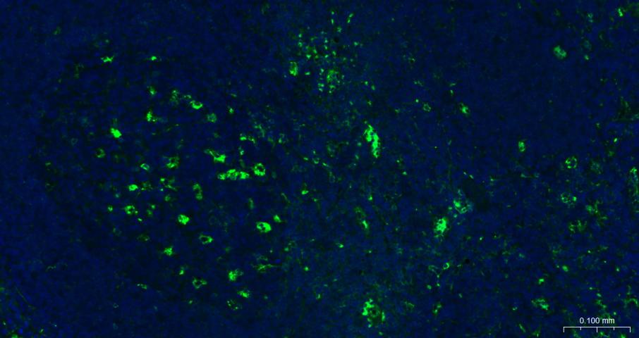 Paraformaldehyde-fixed, paraffin embedded Human tonsils; Antigen retrieval by boiling in sodium citrate buffer (pH6.0) for 15 min; Antibody incubation with AACT Monoclonal Antibody, Unconjugated (bsm-60780R) at 1:200 overnight at 4°C. Followed by conjugated Goat Anti-Rabbit IgG antibody (green, bs-0295G-BF488), DAPI (blue, C02-04002) was used to stain the cell nuclei.