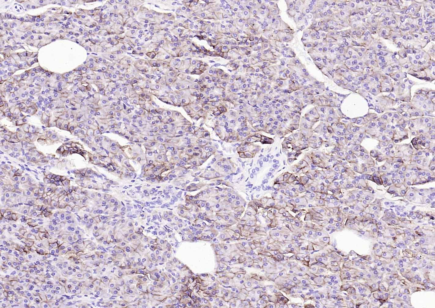 Paraformaldehyde-fixed, paraffin embedded (human pancreas ); Antigen retrieval by boiling in sodium citrate buffer (pH6.0) for 15min; Block endogenous peroxidase by 3% hydrogen peroxide for 20 minutes; Blocking buffer (normal goat serum) at 37°C for 30min; Incubation with (ENPP1) Monoclonal Antibody, Unconjugated (bsm-60785R) at 1:1000 overnight at 4°C, followed by operating according to SP Kit(Rabbit) (sp-0023) instructionsand DAB staining.