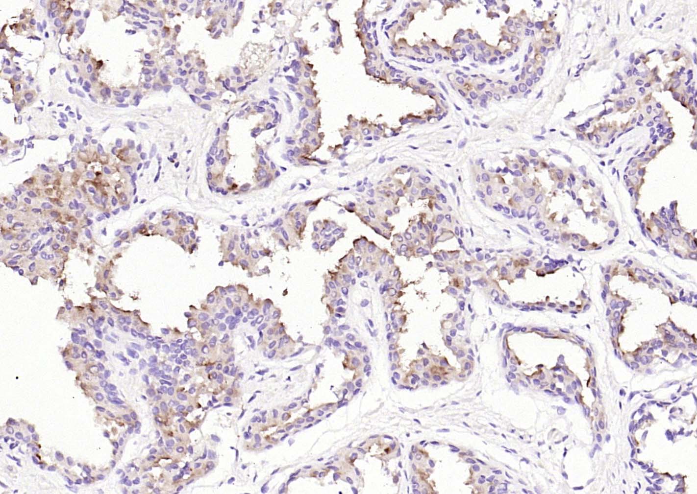 Paraformaldehyde-fixed, paraffin embedded (Human prostate); Antigen retrieval by boiling in sodium citrate buffer (pH6.0) for 15min; Block endogenous peroxidase by 3% hydrogen peroxide for 20 minutes; Blocking buffer (normal goat serum) at 37°C for 30min; Incubation with (FOLH1) Monoclonal Antibody, Unconjugated (bsm-60787R) at 1:100 overnight at 4°C, followed by operating according to SP Kit(Rabbit) (sp-0023) instructionsand DAB staining.