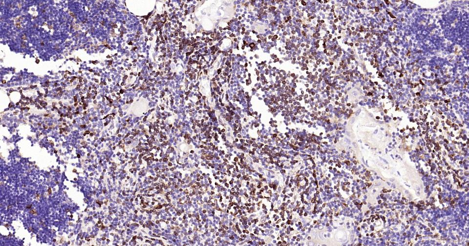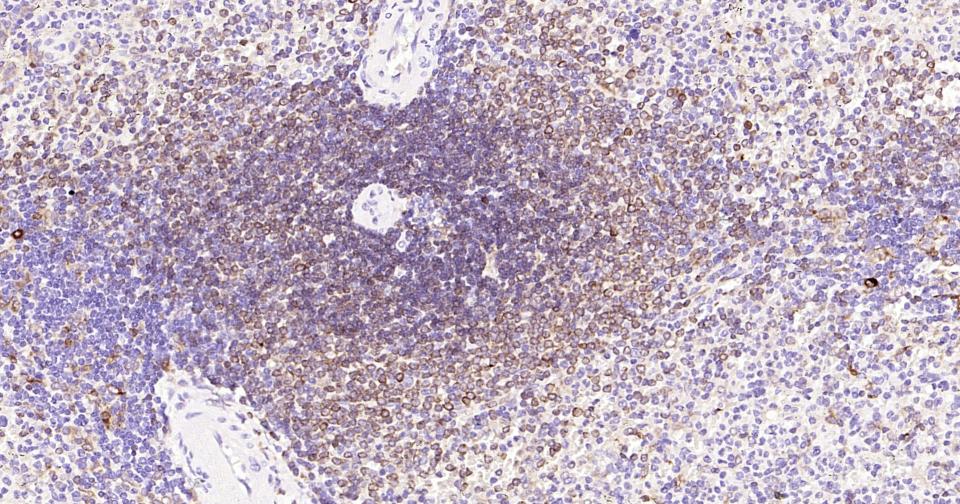 CD74, also known as the MHC class II associated invariant chain (Ii), is a type II transmembrane protein which binds to the peptide binding groove of newly synthesized MHC class II alpha/beta heterodimers and prevents their premature association with endogenous polypeptides. CD74 is produced in molar excess over MHC class II and some of this is expressed by an unknown pathway on the cell surface independent of, or in association with, MHC class II molecules. The half life of CD74 on the cell surface is only 3 to 4 min after which it is internalized. It has been proposed that cell surface CD74 binds The protein encoded by this gene associates with class II major histocompatibility complex (MHC) and is an important chaperone that regulates antigen presentation for immune response. It also serves as cell surface receptor for the cytokine macrophage migration inhibitory factor (MIF) which, when bound to the encoded protein, initiates survival pathways and cell proliferation. This protein also interacts with amyloid precursor protein (APP) and suppresses the production of amyloid beta (Abeta). Multiple alternatively spliced transcript variants encoding different isoforms have been identified. [provided by RefSeq, Aug 2011] Function: Plays a critical role in MHC class II antigen processing by stabilizing peptide-free class II alpha/beta heterodimers in a complex soon after their synthesis and directing transport of the complex from the endoplasmic reticulum to the endosomal/lysosomal system where the antigen processing and binding of antigenic peptides to MHC class II takes place. Serves as cell surface receptor for the cytokine MIF. Subunit: Homotrimer. In the endoplasmic reticulum (ER) it forms a heterononameric MHC II-Ii complex: 3 MHC class II molecules (heterodimers of an alpha and a beta subunit) bind to the CD74 homotrimer (also known as invariant chain or HLA class II histocompatibility antigen gamma chain). In the endosomal/lysosomal system, the CD74 component undergoes sequential degradation by various proteases, including CTSS and CTSL, leaving a small fragment termed CLIP (class-II-associated invariant chain peptide) attached to the MHC class II molecule (alpha-beta-CLIP complex). This processed complex interacts with HLA_DM and HLA_DO heterodimers in order to release CLIP and facilitate the binding of antigenic peptides to the MHC class II molecules. Subcellular Location: Cell membrane; Single-pass type II membrane protein (Potential). Endoplasmic reticulum membrane. Golgi apparatus, trans-Golgi network. Endosome. Lysosome. Note=Transits through a number of intracellular compartments in the endocytic pathway. It can either undergo proteolysis or reach the cell membrane. Post-translational modifications: N- and O-glycosylated. O-glycosylated with core 1 or possibly core 8 glycans. DISEASE: Note=A chromosomal aberration involving CD74 is found in a non-small cell lung tumor. Results in the formation of a CD74-ROS1 chimeric protein. Similarity: Contains 1 thyroglobulin type-1 domain. SWISS: P04233 Gene ID: 972 Database links: Entrez Gene: 972 Human Entrez Gene: 16149 Mouse Omim: 142790 Human SwissProt: P04233 Human SwissProt: P04441 Mouse Unigene: 436568 Human CD74表達(dá)于所有B細(xì)胞和某些T細(xì)胞亞類(lèi)(MHC II陽(yáng)性),具有幾種異構(gòu)體形式(33,35和41kDa),是HLA-DR的恒定鏈。該抗體主要用于標(biāo)記生發(fā)中心及外套B細(xì)胞(80%)和R-S細(xì)胞(70%)以及少數(shù)T細(xì)胞(20%),常與其它B細(xì)胞標(biāo)記如CD20或CD45RA聯(lián)合檢測(cè),用于B細(xì)胞淋巴瘤的輔助診斷。 |