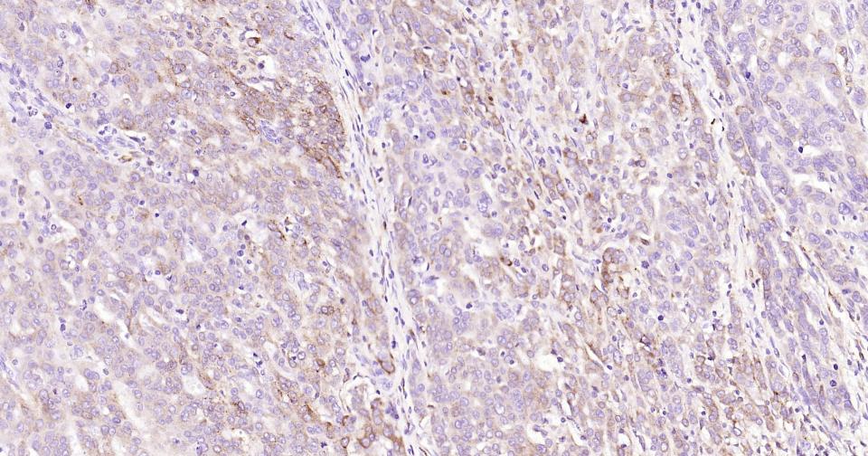Paraformaldehyde-fixed, paraffin embedded Human Ovarian Cancer; Antigen retrieval by boiling in sodium citrate buffer (pH6.0) for 15 min; Antibody incubation with CD74 Monoclonal Antibody, Unconjugated(bsm-60795R) at 1:200 overnight at 4°C, followed by conjugation to the SP Kit (Rabbit, SP-0023)and DAB (C-0010) staining.