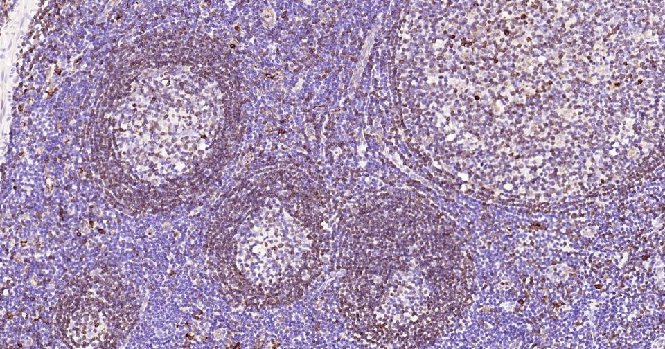 Paraformaldehyde-fixed, paraffin embedded Human Spleen; Antigen retrieval by boiling in sodium citrate buffer (pH6.0) for 15 min; Antibody incubation with CD74 Monoclonal Antibody, Unconjugated(bsm-60795R) at 1:200 overnight at 4°C, followed by conjugation to the SP Kit (Rabbit, SP-0023)and DAB (C-0010) staining.