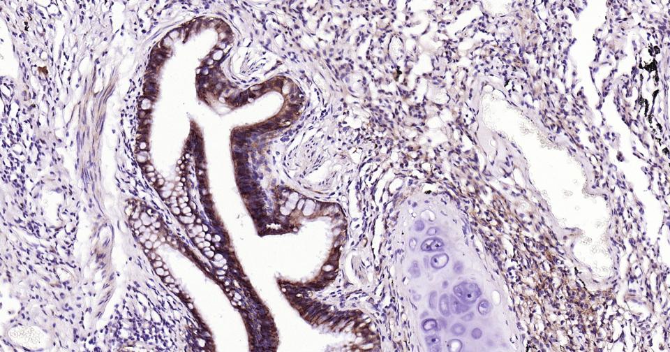 Paraformaldehyde-fixed, paraffin embedded Human Lung; Antigen retrieval by boiling in sodium citrate buffer (pH6.0) for 15 min; Antibody incubation with EpCAM Monoclonal Antibody, Unconjugated(bsm-60797R) at 1:200 overnight at 4°C, followed by conjugation to the bs-0295G-HRP and DAB (C-0010) staining.