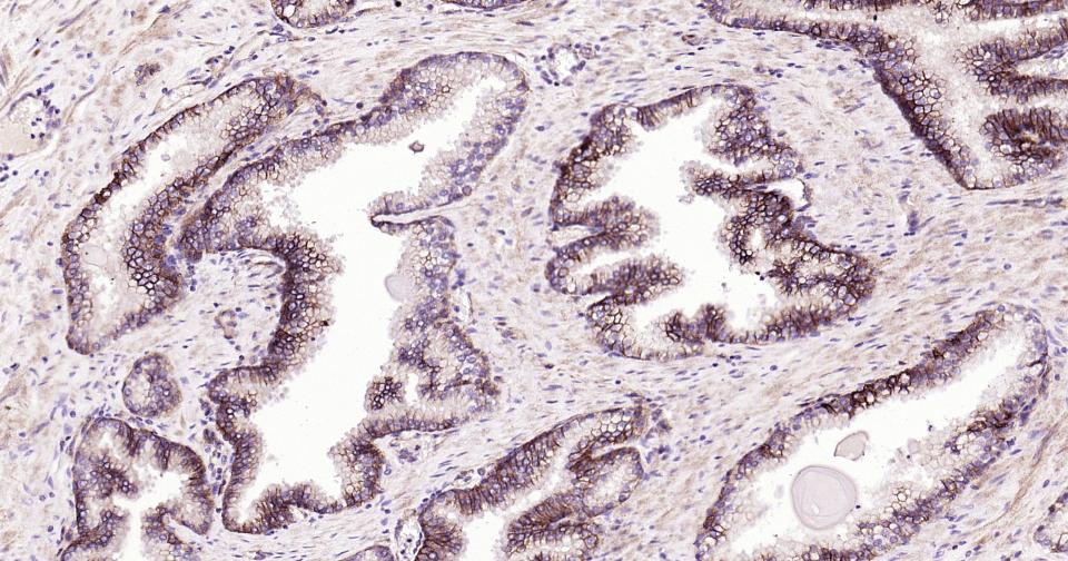 Paraformaldehyde-fixed, paraffin embedded Human Prostate; Antigen retrieval by boiling in sodium citrate buffer (pH6.0) for 15 min; Antibody incubation with EpCAM Monoclonal Antibody, Unconjugated(bsm-60797R) at 1:200 overnight at 4°C, followed by conjugation to the bs-0295G-HRP and DAB (C-0010) staining.