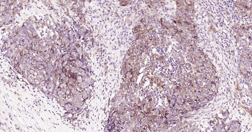 Paraformaldehyde-fixed, paraffin embedded (human breast carcinoma ); Antigen retrieval by boiling in EDTA buffer (pH9.0) for 15min; Block endogenous peroxidase by 3% hydrogen peroxide for 20 minutes; Blocking buffer (normal goat serum) at 37°C for 30min; Incubation with (EpCAM) Monoclonal Antibody, Unconjugated (bsm-60797R) at 1:100 overnight at 4°C, followed by operating according to SP Kit(Rabbit) (sp-0023) instructionsand DAB staining.