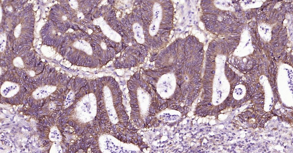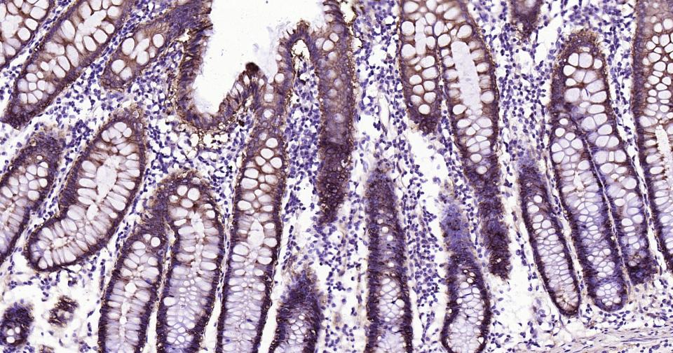 Paraformaldehyde-fixed, paraffin embedded Human Colon; Antigen retrieval by boiling in sodium citrate buffer (pH6.0) for 15 min; Antibody incubation with EpCAM Monoclonal Antibody, Unconjugated(bsm-60797R) at 1:200 overnight at 4°C, followed by conjugation to the bs-0295G-HRP and DAB (C-0010) staining.