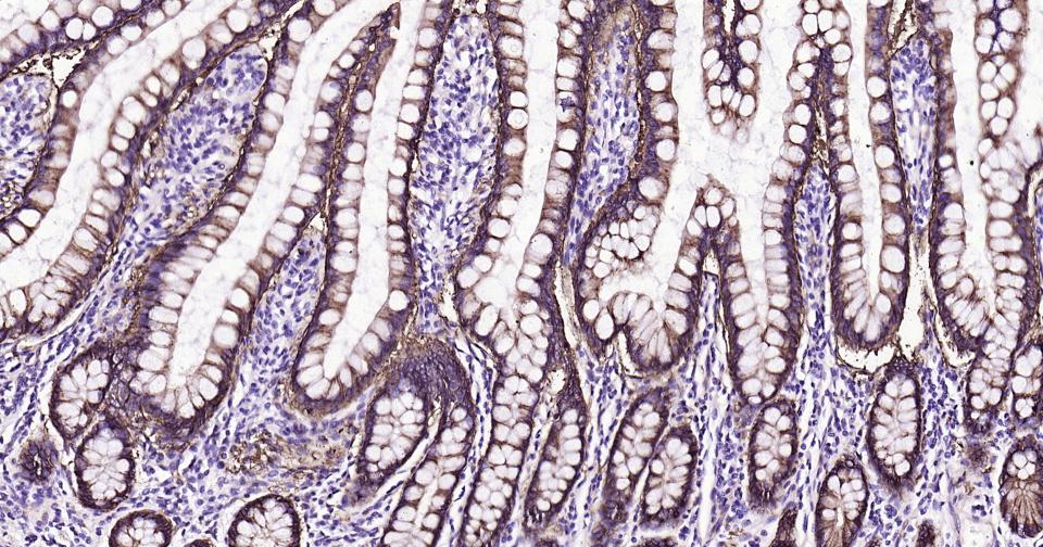 Paraformaldehyde-fixed, paraffin embedded Human Small Intestine; Antigen retrieval by boiling in sodium citrate buffer (pH6.0) for 15 min; Antibody incubation with EpCAM Monoclonal Antibody, Unconjugated(bsm-60797R) at 1:200 overnight at 4°C, followed by conjugation to the bs-0295G-HRP and DAB (C-0010) staining.