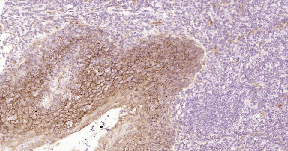 Paraformaldehyde-fixed, paraffin embedded Human Tonsil; Antigen retrieval by boiling in sodium citrate buffer (pH6.0) for 15 min; Antibody incubation with EpCAM Monoclonal Antibody, Unconjugated(bsm-60797R) at 1:200 overnight at 4°C, followed by conjugation to the bs-0295G-HRP and DAB (C-0010) staining.