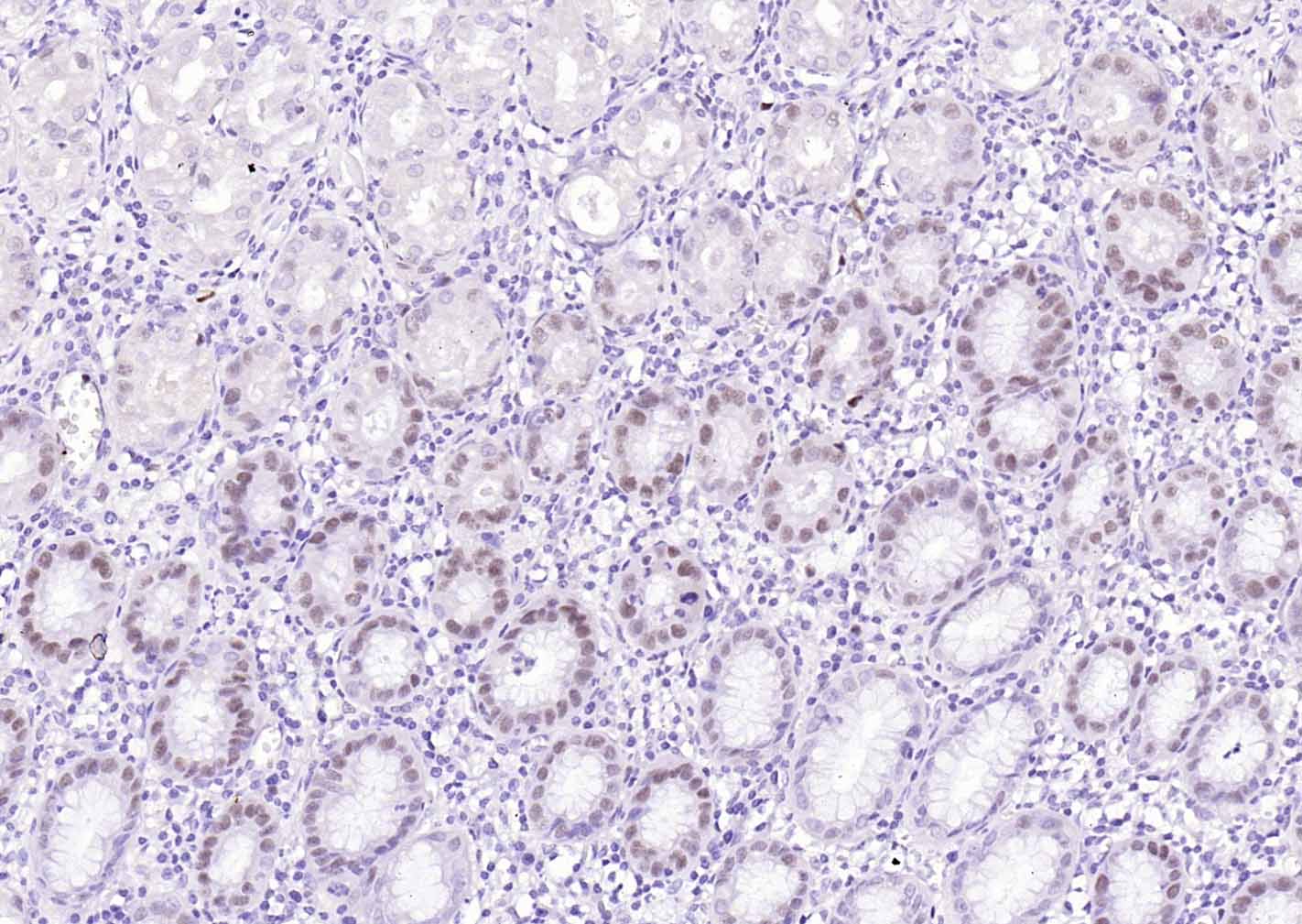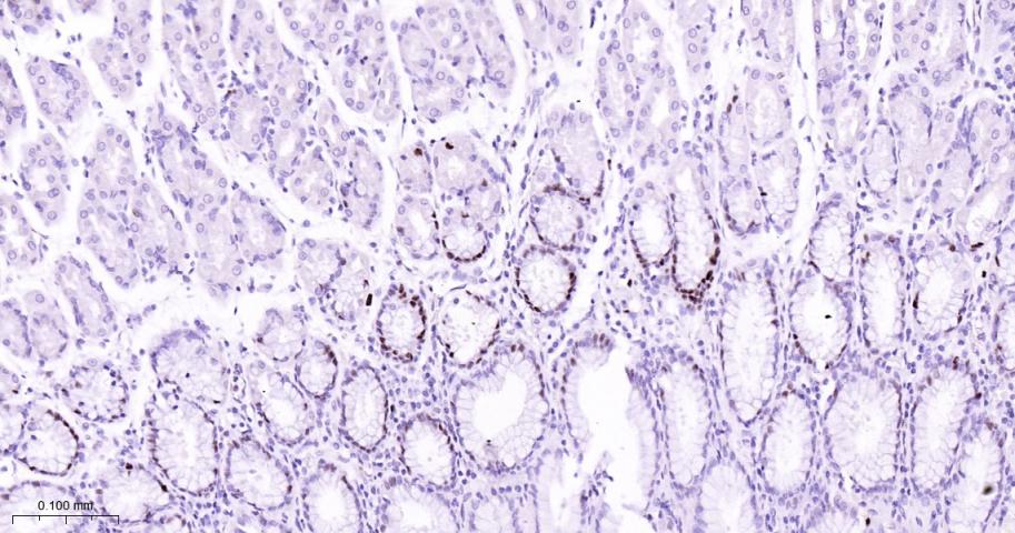 Paraformaldehyde-fixed, paraffin embedded (human stomach); Antigen retrieval by boiling in sodium citrate buffer (pH6.0) for 15min; Block endogenous peroxidase by 3% hydrogen peroxide for 20 minutes; Blocking buffer (normal goat serum) at 37°C for 30min; Incubation with (MCM7 ) Monoclonal Antibody, Unconjugated (bsm-60801R) at 1:100 overnight at 4°C, followed by operating according to SP Kit(Rabbit) (sp-0023) instructionsand DAB staining.