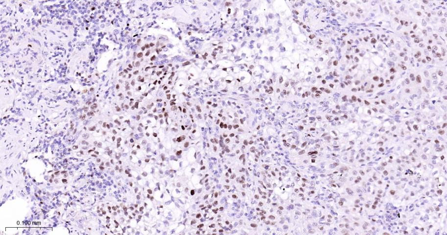 Paraformaldehyde-fixed, paraffin embedded Human lung squamous cell carcinoma; Antigen retrieval by boiling in sodium citrate buffer (pH6.0) for 15 min; Antibody incubation with MCM7 Monoclonal Antibody, Unconjugated(bsm-60801R) at 1:150 overnight at 4°C, followed by conjugation to the bs-0295G-HRP and DAB (C-0010) staining.