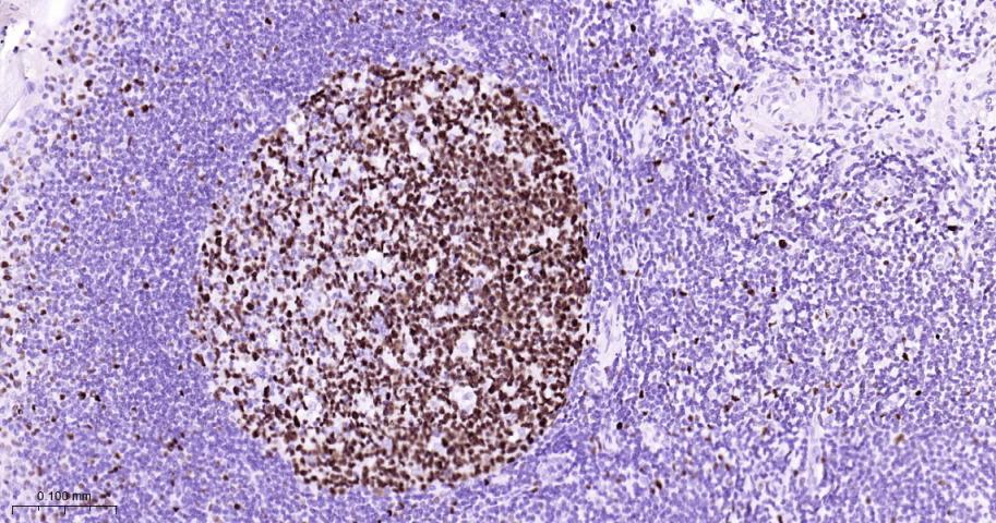 Paraformaldehyde-fixed, paraffin embedded Human Tonsil; Antigen retrieval by boiling in sodium citrate buffer (pH6.0) for 15 min; Antibody incubation with MCM7 Monoclonal Antibody, Unconjugated(bsm-60801R) at 1:150 overnight at 4°C, followed by conjugation to the bs-0295G-HRP and DAB (C-0010) staining.