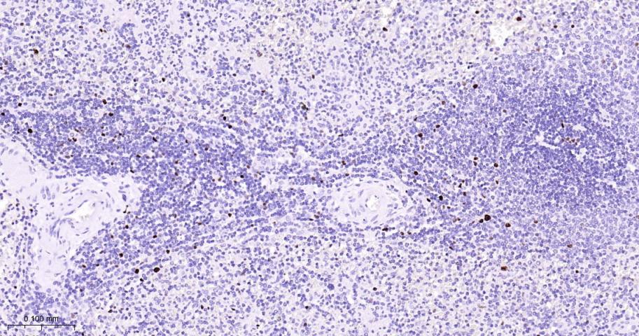 Paraformaldehyde-fixed, paraffin embedded Human Spleen; Antigen retrieval by boiling in sodium citrate buffer (pH6.0) for 15 min; Antibody incubation with MCM7 Monoclonal Antibody, Unconjugated(bsm-60801R) at 1:150 overnight at 4°C, followed by conjugation to the bs-0295G-HRP and DAB (C-0010) staining.