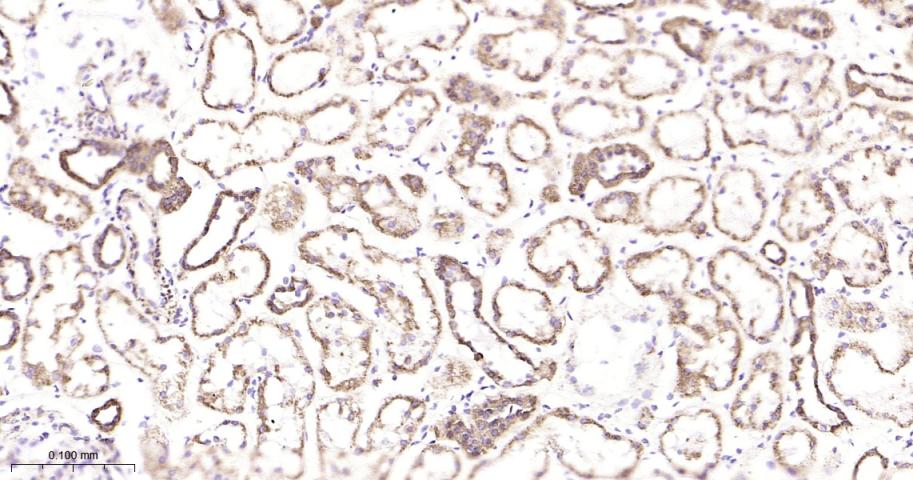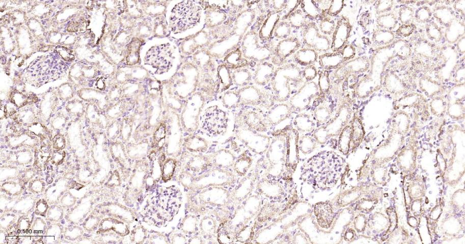 Paraformaldehyde-fixed, paraffin embedded Human Kidney; Antigen retrieval by boiling in sodium citrate buffer (pH6.0) for 15 min; Antibody incubation with ATPB Monoclonal Antibody, Unconjugated(bsm-52904R) at 1:200 overnight at 4°C, followed by conjugation to the bs-0295G-HRP and DAB (C-0010) staining.