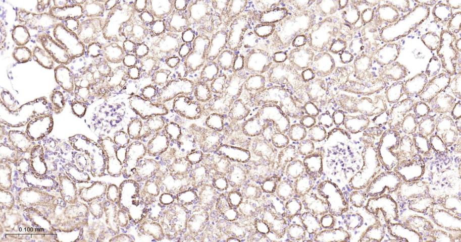 Paraformaldehyde-fixed, paraffin embedded Mouse Kidney; Antigen retrieval by boiling in sodium citrate buffer (pH6.0) for 15 min; Antibody incubation with ATPB Monoclonal Antibody, Unconjugated(bsm-52904R) at 1:200 overnight at 4°C, followed by conjugation to the bs-0295G-HRP and DAB (C-0010) staining.
