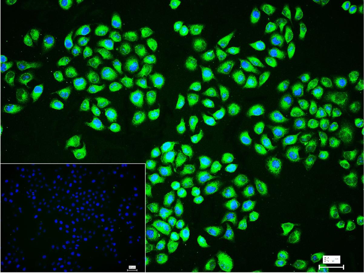 4% Paraformaldehyde-fixed Hela (H) cell; Triton X-100 at r.t. for 20 min; Antibody incubation with (ATPB) monoclonal Antibody, unconjugated (bsm-52904R) 1:100, 90 min at 37°C; followed by conjugated Goat Anti-Rabbit IgG antibody (green, bs-40295G-FITC) at 37°C for 90 min, DAPI (blue, C02-04002) was used to stain the cell nuclei. PBS instead of the primary antibody was used as the blank control.