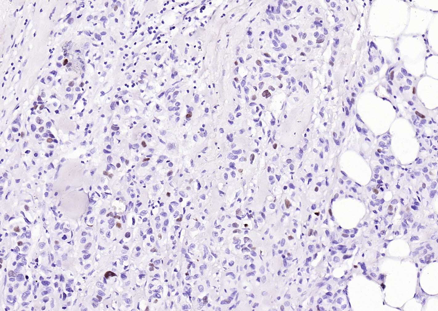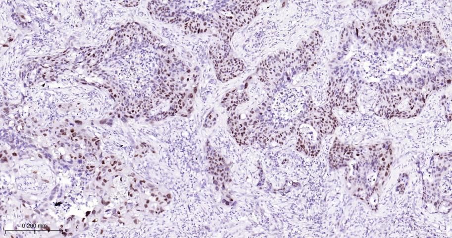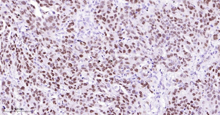 Paraformaldehyde-fixed, paraffin embedded (human breast carcinoma); Antigen retrieval by boiling in sodium citrate buffer (pH6.0) for 15min; Block endogenous peroxidase by 3% hydrogen peroxide for 20 minutes; Blocking buffer (normal goat serum) at 37°C for 30min; Incubation with (p53 ) Monoclonal Antibody, Unconjugated (bsm-60806R) at 1:500 overnight at 4°C, followed by operating according to SP Kit(Rabbit) (sp-0023) instructionsand DAB staining.