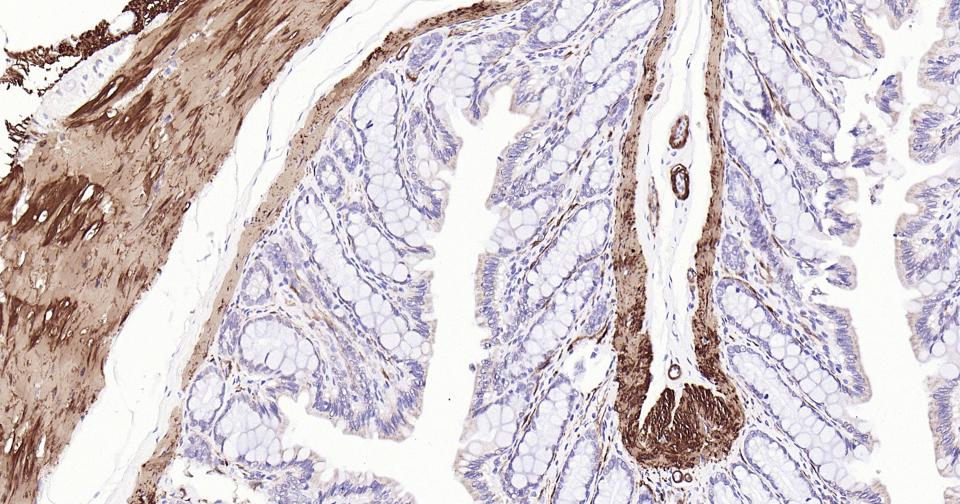 Paraformaldehyde-fixed, paraffin embedded Mouse Colon; Antigen retrieval by boiling in sodium citrate buffer (pH6.0) for 15 min; Antibody incubation with CNN1 Monoclonal Antibody, Unconjugated(bsm-60845R) at 1:200 overnight at 4°C, followed by conjugation to the SP Kit (Rabbit, SP-0023) and DAB (C-0010) staining.