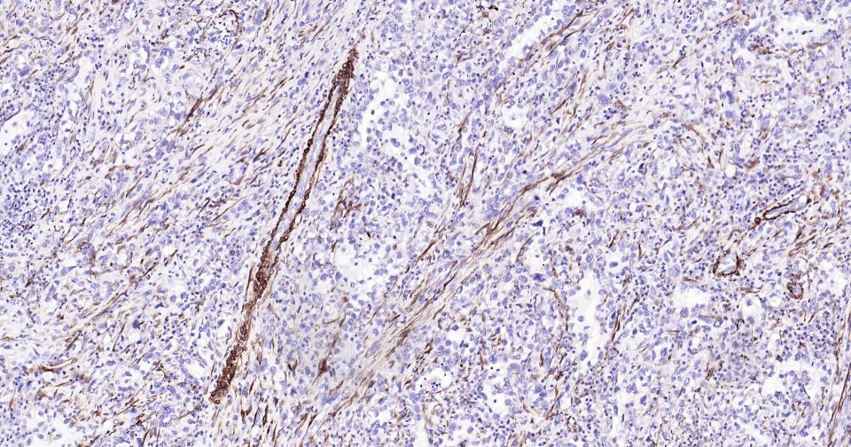 Paraformaldehyde-fixed, paraffin embedded Human Cervical Cancer; Antigen retrieval by boiling in sodium citrate buffer (pH6.0) for 15 min; Antibody incubation with CNN1 Monoclonal Antibody, Unconjugated(bsm-60845R) at 1:200 overnight at 4°C, followed by conjugation to the SP Kit (Rabbit, SP-0023) and DAB (C-0010) staining.