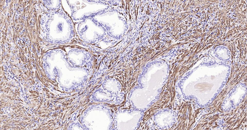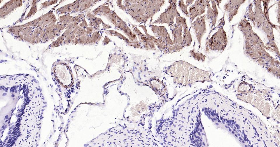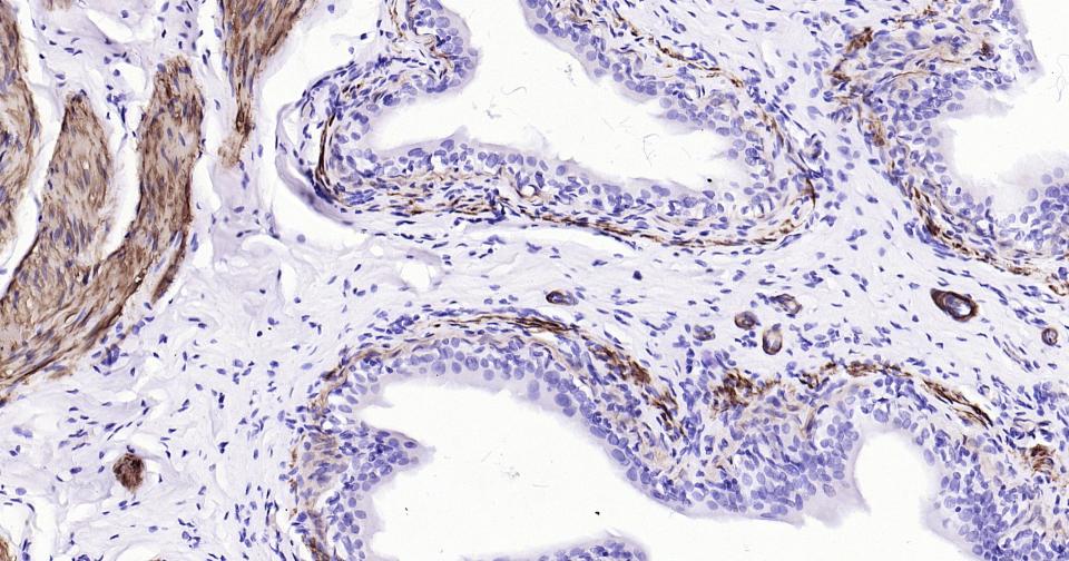 Paraformaldehyde-fixed, paraffin embedded Human Prostate; Antigen retrieval by boiling in sodium citrate buffer (pH6.0) for 15 min; Antibody incubation with CNN1 Monoclonal Antibody, Unconjugated(bsm-60845R) at 1:200 overnight at 4°C, followed by conjugation to the SP Kit (Rabbit, SP-0023) and DAB (C-0010) staining.
