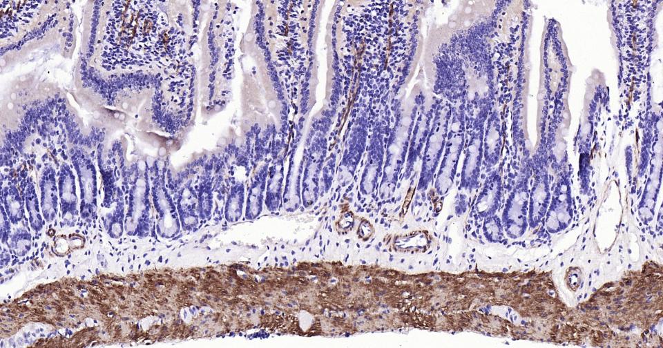 Paraformaldehyde-fixed, paraffin embedded Mouse Small Intestine; Antigen retrieval by boiling in sodium citrate buffer (pH6.0) for 15 min; Antibody incubation with CNN1 Monoclonal Antibody, Unconjugated(bsm-60845R) at 1:200 overnight at 4°C, followed by conjugation to the SP Kit (Rabbit, SP-0023) and DAB (C-0010) staining.