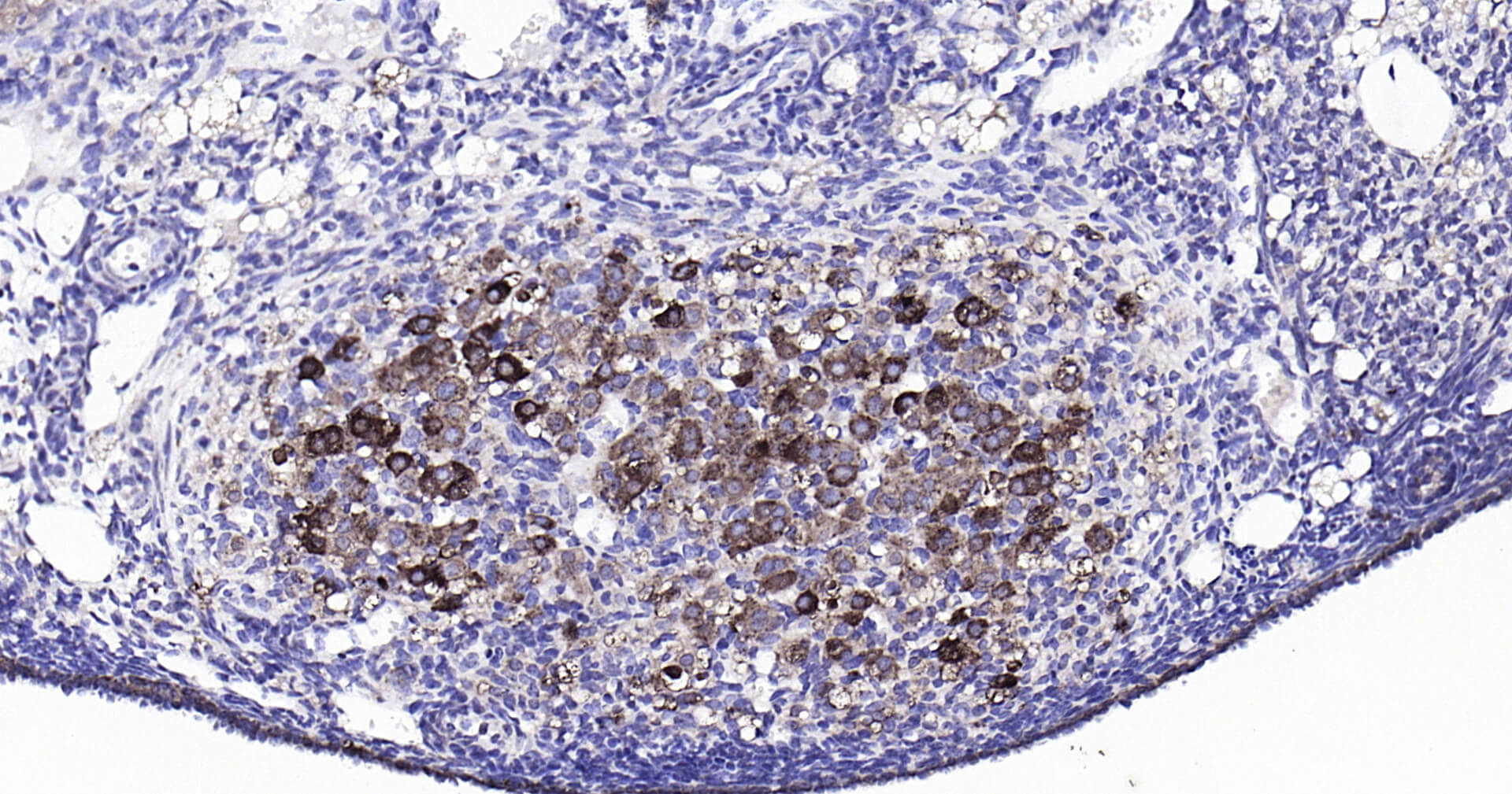 Immunohistochemical analysis of paraffin embedded mouse ovary tissue slide using IHC0124 (Cathepsin L IHC Kit).
