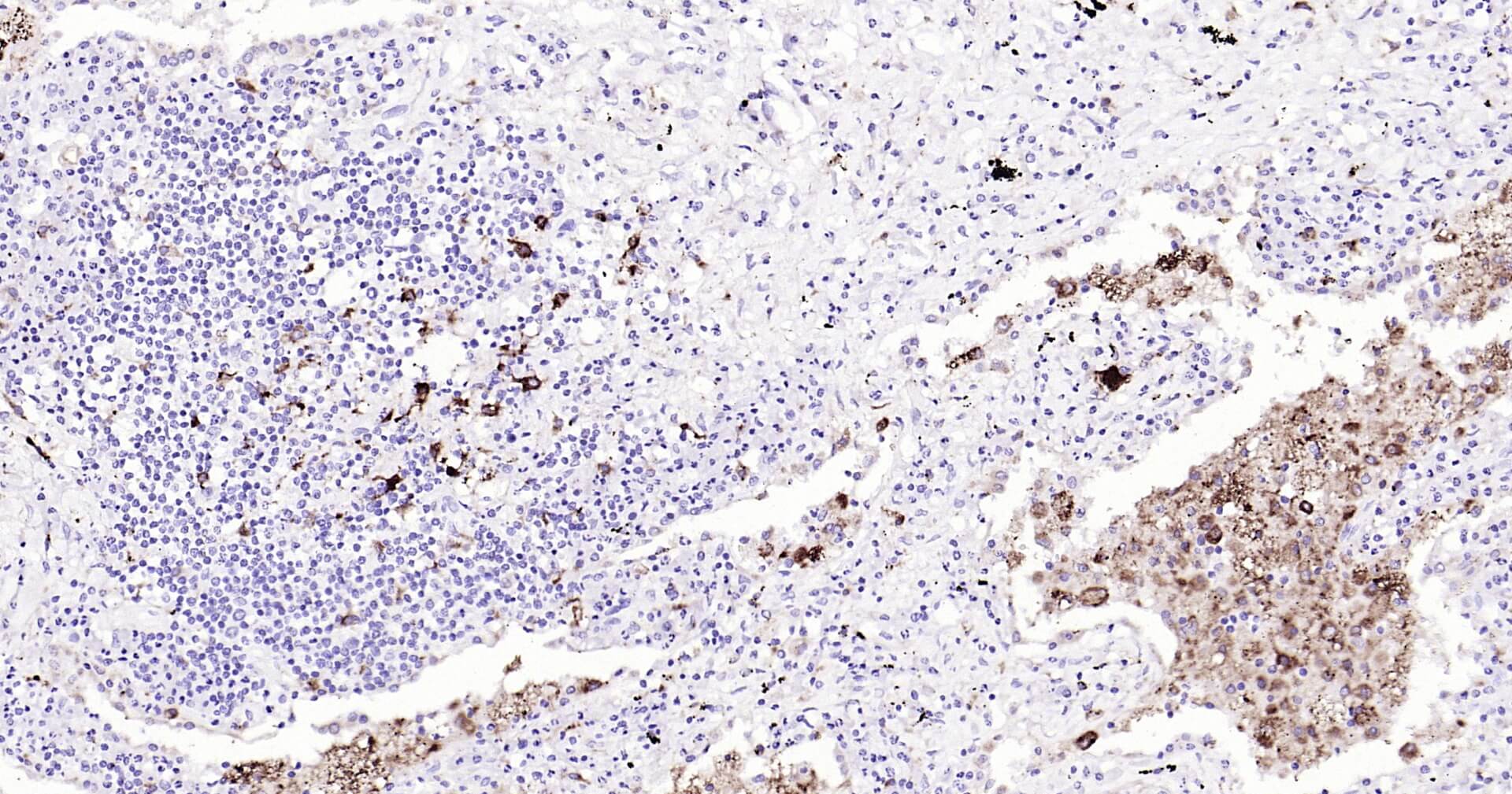 Immunohistochemical analysis of paraffin embedded human liver tissue slide using IHC0133H (Human CD68 IHC Kit).