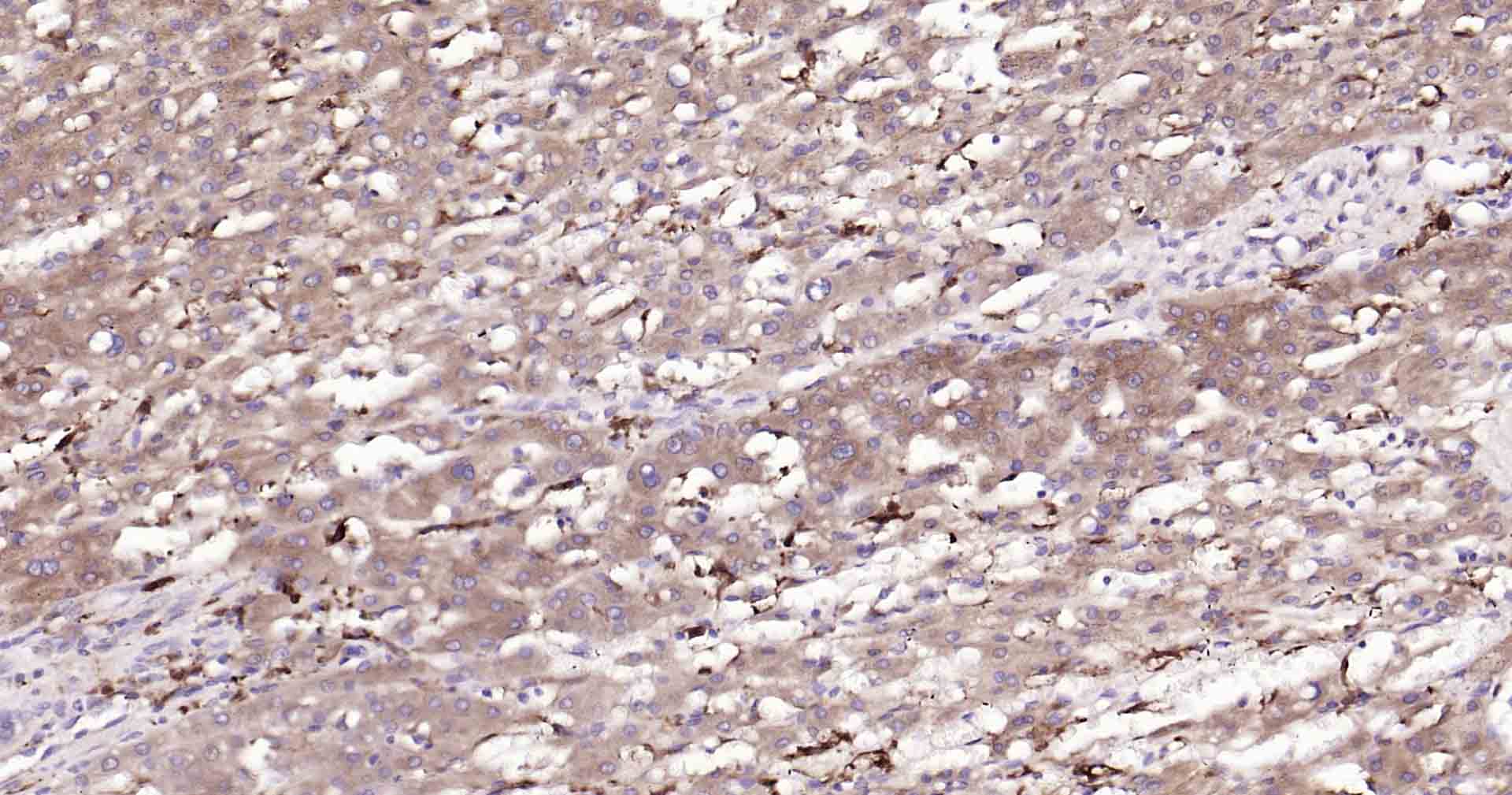 Paraformaldehyde-fixed, paraffin embedded Human Liver Cancer; Antigen retrieval by boiling in sodium citrate buffer (pH6.0) for 15 min; Antibody incubation with Beclin 1 Monoclonal Antibody, Unconjugated(bsm-41365R) at 1:50 overnight at 4°C, followed by conjugation to the SP Kit (Rabbit, SP-0023) and DAB (C-0010) staining.