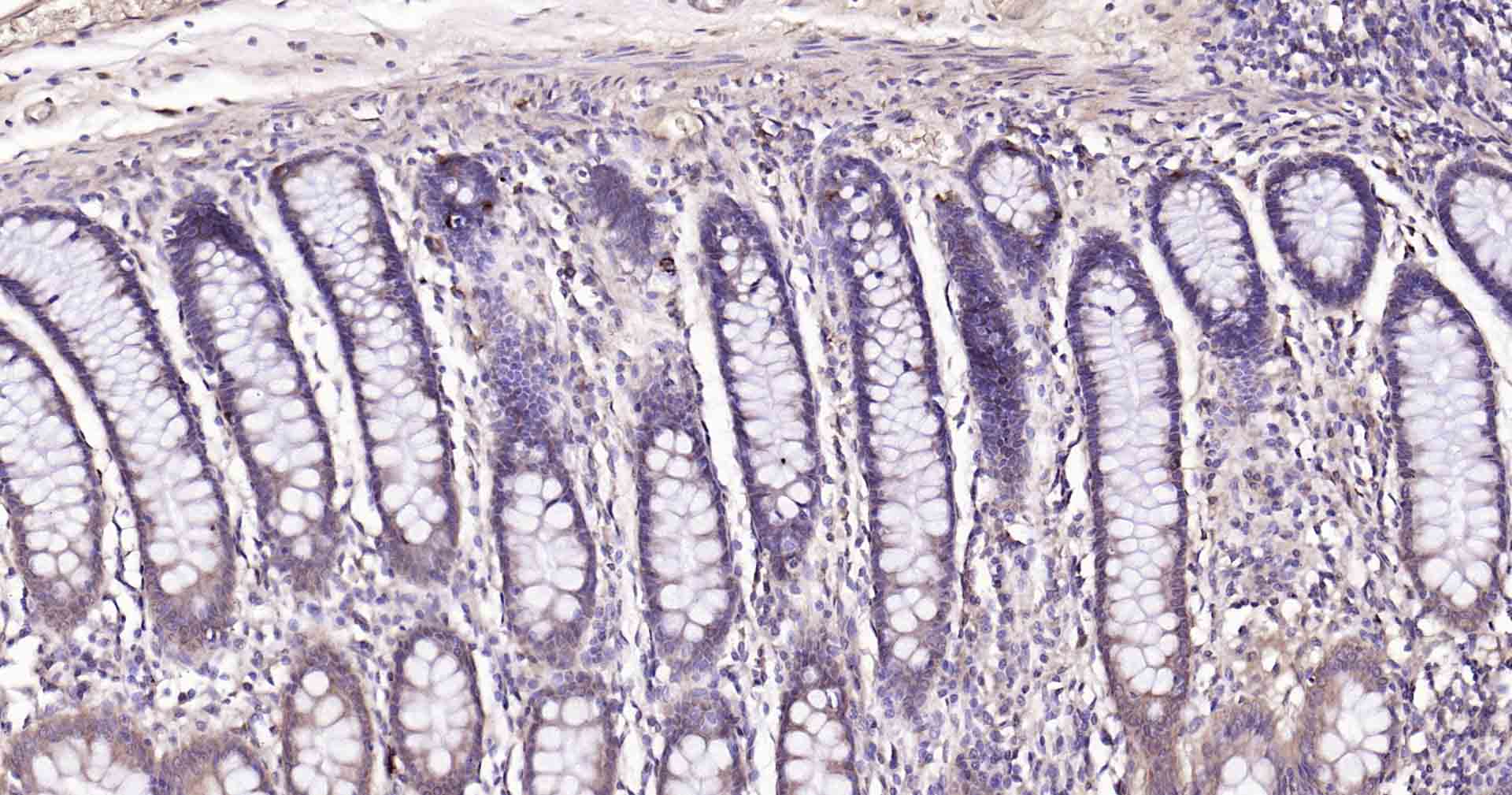 Paraformaldehyde-fixed, paraffin embedded Mouse Colon; Antigen retrieval by boiling in sodium citrate buffer (pH6.0) for 15 min; Antibody incubation with Beclin 1 Monoclonal Antibody, Unconjugated(bsm-41365R) at 1:50 overnight at 4°C, followed by conjugation to the SP Kit (Rabbit, SP-0023) and DAB (C-0010) staining.