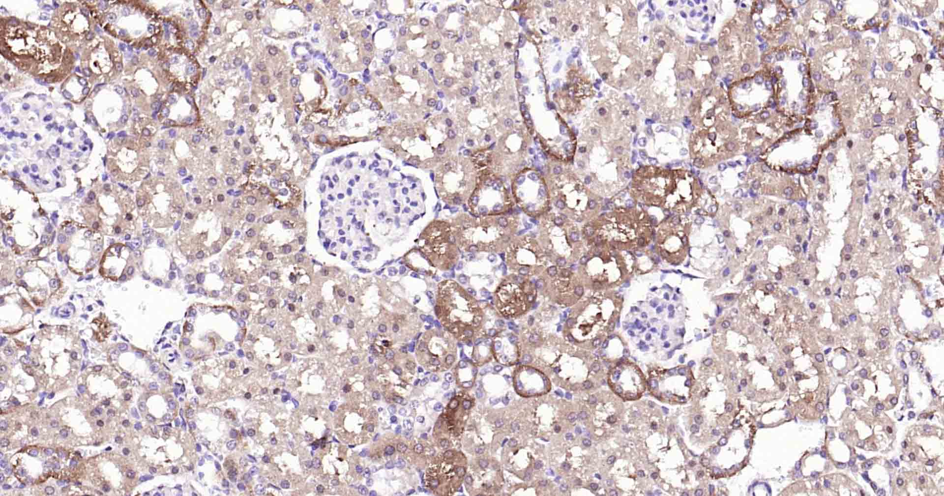 Paraformaldehyde-fixed, paraffin embedded Mouse Kidney; Antigen retrieval by boiling in sodium citrate buffer (pH6.0) for 15 min; Antibody incubation with Beclin 1 Monoclonal Antibody, Unconjugated(bsm-41365R) at 1:50 overnight at 4°C, followed by conjugation to the SP Kit (Rabbit, SP-0023) and DAB (C-0010) staining.