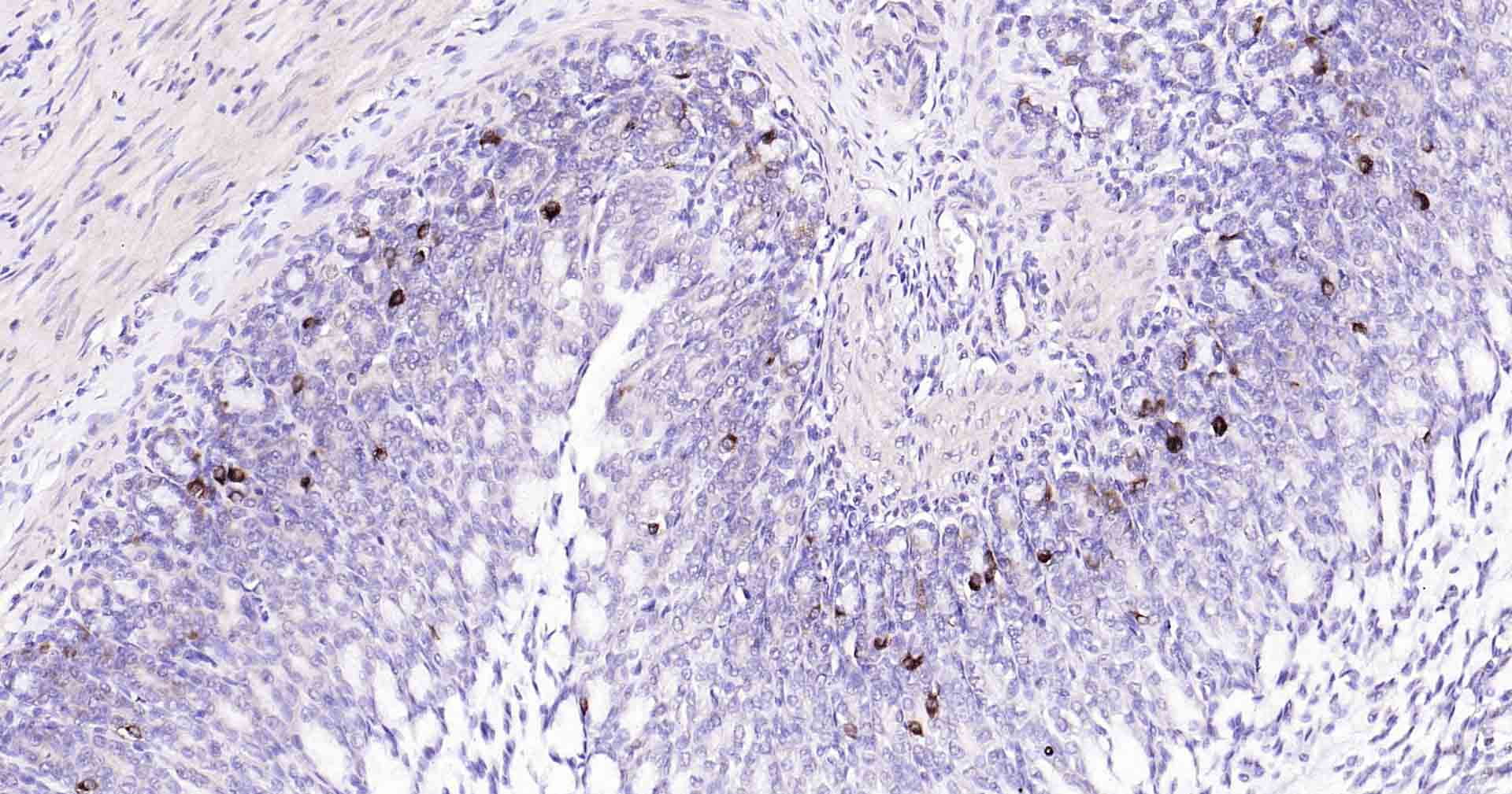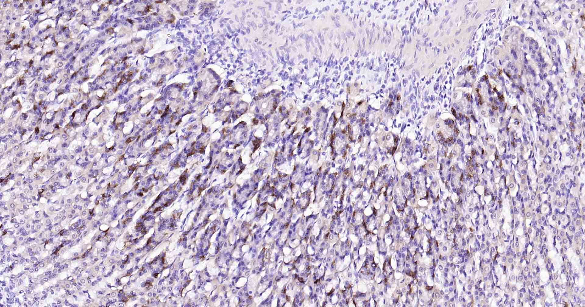 Paraformaldehyde-fixed, paraffin embedded Mouse Stomach; Antigen retrieval by boiling in sodium citrate buffer (pH6.0) for 15 min; Antibody incubation with Beclin 1 Monoclonal Antibody, Unconjugated(bsm-41365R) at 1:50 overnight at 4°C, followed by conjugation to the SP Kit (Rabbit, SP-0023) and DAB (C-0010) staining.