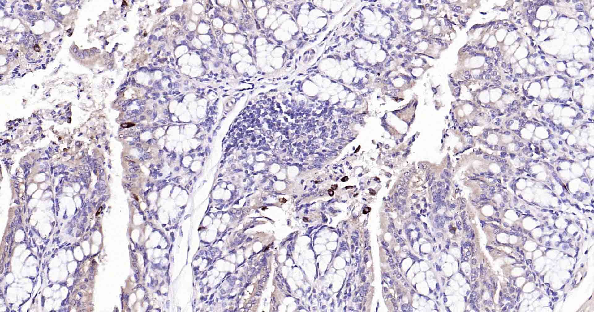 Paraformaldehyde-fixed, paraffin embedded Human Colon; Antigen retrieval by boiling in sodium citrate buffer (pH6.0) for 15 min; Antibody incubation with Beclin 1 Monoclonal Antibody, Unconjugated(bsm-41365R) at 1:50 overnight at 4°C, followed by conjugation to the SP Kit (Rabbit, SP-0023) and DAB (C-0010) staining.