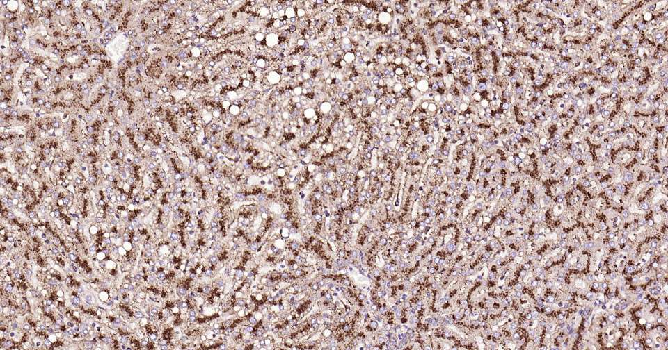 Immunohistochemical analysis of paraffin embedded human liver tissue slide using IHC0137H (Human LAMP1 Kit).