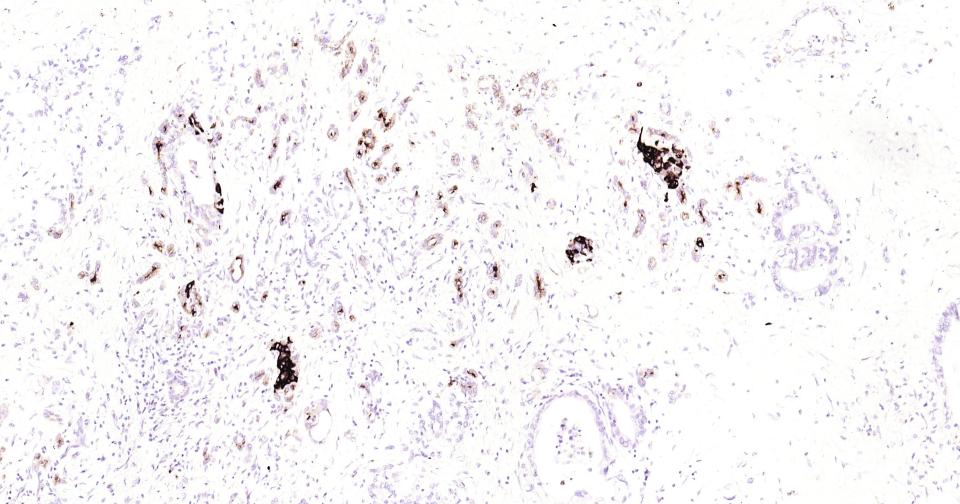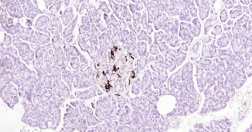 Paraformaldehyde-fixed, paraffin embedded Human Pancreas; Antigen retrieval by boiling in sodium citrate buffer (pH6.0) for 15 min; Antibody incubation with Osteopontin? Monoclonal Antibody, Unconjugated(bsm-43600R) at 1:200 overnight at 4°C, followed by conjugation to the SP Kit (Rabbit, SP-0023)and DAB (C-0010) staining.