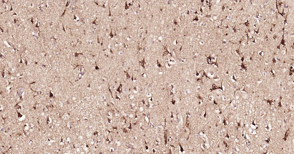 Paraformaldehyde-fixed, paraffin embedded Human Cerebrum; Antigen retrieval by boiling in sodium citrate buffer (pH6.0) for 15 min; Antibody incubation with Osteopontin? Monoclonal Antibody, Unconjugated(bsm-43600R) at 1:200 overnight at 4°C, followed by conjugation to the SP Kit (Rabbit, SP-0023)and DAB (C-0010) staining.