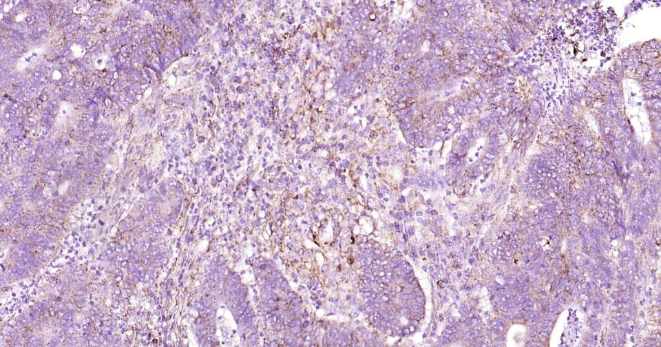 Paraformaldehyde-fixed, paraffin embedded Human Colon Cancer; Antigen retrieval by boiling in sodium citrate buffer (pH6.0) for 15 min; Antibody incubation with Osteopontin? Monoclonal Antibody, Unconjugated(bsm-43600R) at 1:200 overnight at 4°C, followed by conjugation to the SP Kit (Rabbit, SP-0023)and DAB (C-0010) staining.