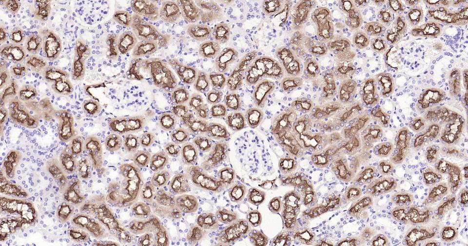 Paraformaldehyde-fixed, paraffin embedded Human Kidney; Antigen retrieval by boiling in sodium citrate buffer (pH6.0) for 15 min; Antibody incubation with LRP2 Monoclonal Antibody, Unconjugated(bsm-42103R) at 1:200 overnight at 4°C, followed by conjugation to the SP Kit (Rabbit, SP-0023)and DAB (C-0010) staining.