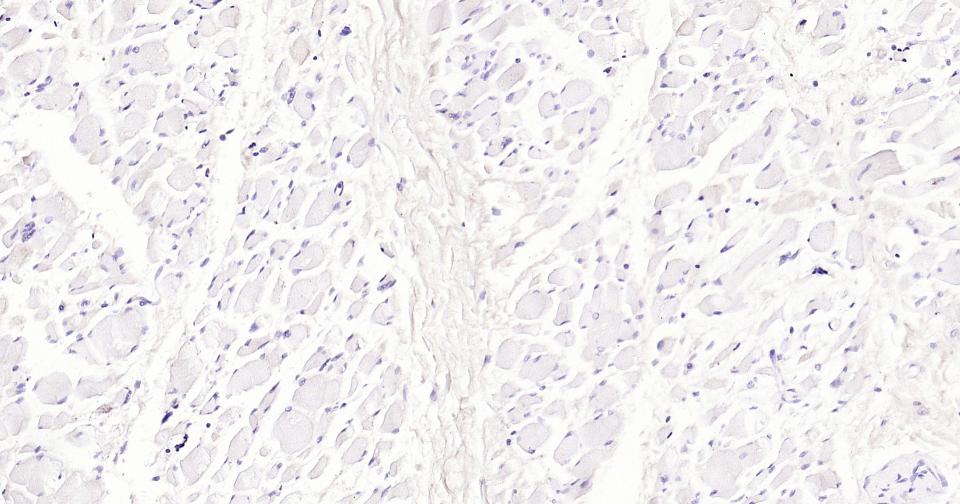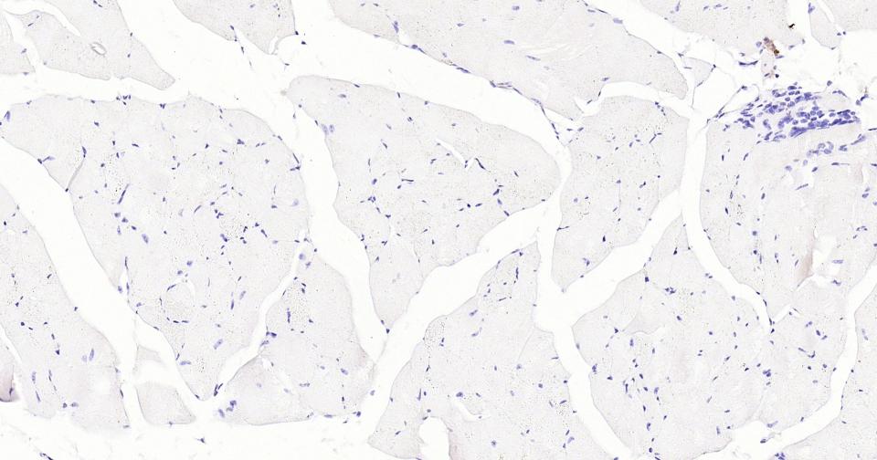 (Negative control)Paraformaldehyde-fixed, paraffin embedded Human Skeletal muscle; Antigen retrieval by boiling in sodium citrate buffer (pH6.0) for 15 min; Antibody incubation with LRP2 Monoclonal Antibody, Unconjugated(bsm-42103R) at 1:200 overnight at 4°C, followed by conjugation to the SP Kit (Rabbit, SP-0023)and DAB (C-0010) staining.